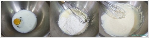 先把蛋和牛奶在攪拌盆裡用打蛋器將之混合