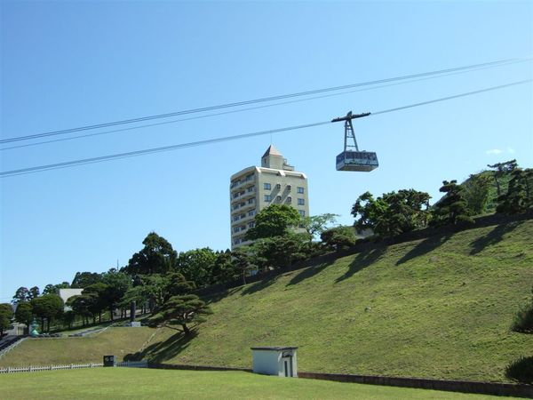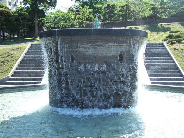 不遠處有個地方可以看到纜車經過的樣子 還有一座漫大的噴水池 裡面立了一個清泉滾滾的碑