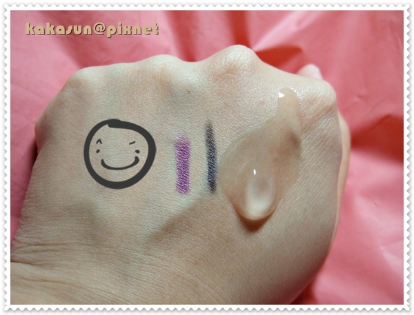 我在手上用MUF的眼線筆和INTEGRATE的眼彩筆畫了兩條彩色的線條