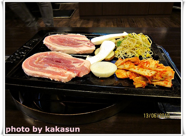 不一會兒 服務生將主角五花肉以及一些配料整齊地排列在烤盤上
