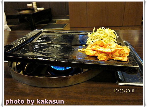 服務生會先將烤盤放在瓦斯爐上 放置的方式很特別 是傾斜地擱置著